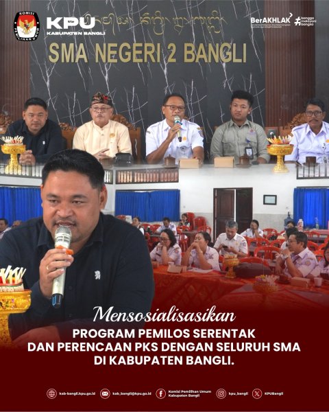 KPU Kabupaten Bangli melaksanakan kegiatan sosialisasi Program Pemilihan OSIS (Pemilos) Serentak sekaligus Perjanjian kerja Sama (PKS) bersama seluruh SMA di Kabupaten Bangli.