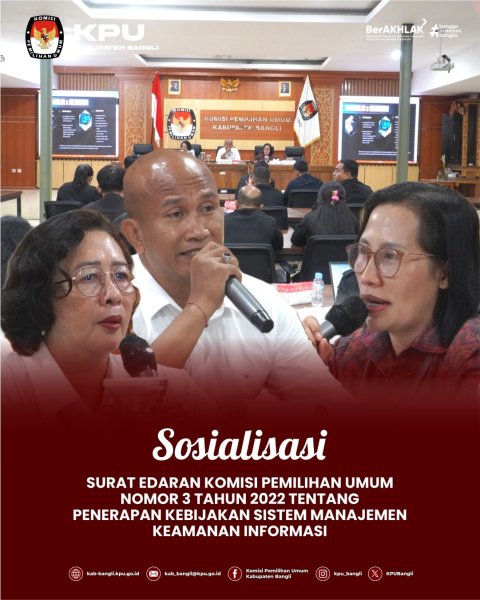 KPU Kabupaten Bangli pada Rabu, 11 Februari 2026 melaksanakan Sosialisasi Surat Edaran Komisi Pemilihan Umum Nomor 3 Tahun 2022 tentang Penerapan Kebijakan Sistem Manajemen Keamanan Informasi. Acara dibuka oleh Anggota KPU Divisi Hukum dan Pengawasan, I D.G. Astika Praja Negara. Setelah kegiatan dibuka maka selanjutnya kegiatan dipandu oleh moderator dari Divisi Perencanaan, Data dan Informasi, Ni Putu Anom Januwintari. Kegiatan ini dihadiri oleh seluruh jajaran KPU Kabupaten Bangli beserta Anggota Bawaslu Kabupaten Bangli yang memiliki peran penting dalam menjaga keamanan informasi penyelenggaraan pemilu. Dalam kegiatan sosialisasi SE Nomor 3 ini menghadirkan Dua orang narasumber yang memberikan informasi tentang keamanan siber. Materi pertama disampaikan oleh Kasat Intelkam Polres Bangli, AKP Ida Bagus Nyoman Asmara Jaya, yang menekankan pentingnya penguatan sistem manajemen keamanan informasi dalam mengantisipasi ancaman terhadap keamanan pemilu. Selanjutnya, Sekretaris Dinas Kominfosan, Ni Made Ayu Wiratningsih, S.K.M., M.A.P., memberikan paparan mengenai literasi digital sebagai fondasi keamanan siber, dengan menekankan bahwa pemahaman masyarakat terhadap teknologi digital menjadi kunci dalam menjaga integritas informasi. Usai pemaparan materi, kegiatan dilanjutkan dengan sesi diskusi dan tanya jawab yang berlangsung interaktif, membahas berbagai isu aktual terkait keamanan siber. Antusiasme peserta menunjukkan kesadaran bersama akan pentingnya perlindungan data dan informasi dalam proses demokrasi. Dalam kegiatan ini dapat diambil kesimpulan bahwa penguatan Sistem Manajemen Keaman Informasi (SMKI) merupakan langkah strategis dan krusial dalam mengantisipasi berbagai ancaman kemanan pada penyelenggaraan Pemilu dan literasi digital merupakan fondasi utama dalam membangun keaman siber yang kuat dan berkelanjuta. Kemudian kegiatan ditutup oleh Divisi Perencanaan, Data dan Informasi, Ni Putu Anom Januwintari, dengan penegasan bahwa penerapan kebijakan keamanan informasi merupakan langkah strategis untuk menjaga kepercayaan publik terhadap penyelenggaraan pemilu. Video KLIK DISINI ....