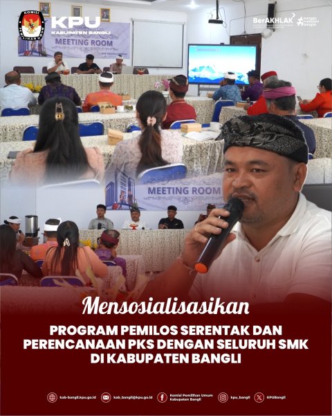 KPU Kabupaten Bangli melaksanakan kegiatan sosialisasi Program Pemilihan OSIS (Pemilos) Serentak sekaligus Perjanjian kerja Sama (PKS) bersama seluruh SMK di Kabupaten Bangli.