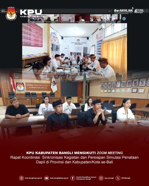 KPU Kabupaten Bangli mengikuti Rapat Koordinasi Sinkronisasi Kegiatan dan Persiapan Simulasi Penataan Daerah Pemilihan di Provinsi dan Kabupaten/Kota se-Bali yang diselenggarakan oleh KPU Provinsi Bali secara dari pada Hari Senin, 12 Februari 2026. Kegiatan dihadiri oleh Ketua KPU Kabupaten Bangli, I Kadek Adiawan, Ketua Divisi Teknis Penyelenggaraan KPU Kabupaten Bangli, I Ketut Suandana dan Kasubbag yang membidangi Teknis Penyelenggaraan, Ni Nyoman Sukma Sekarpiyanti beserta staf pelaksana. Dalam penataan daerah Pemilihan dengan memperhatikan prinsip yang terdiri dari kesetaraan nilai suara, ketaatan pada sistem Pemilu yang proporsionalitas, proporsionalitas, integralitas wilayah, berada dalam cakupan wilayah yang sama, kohesivitas dan kesinambungan. ....