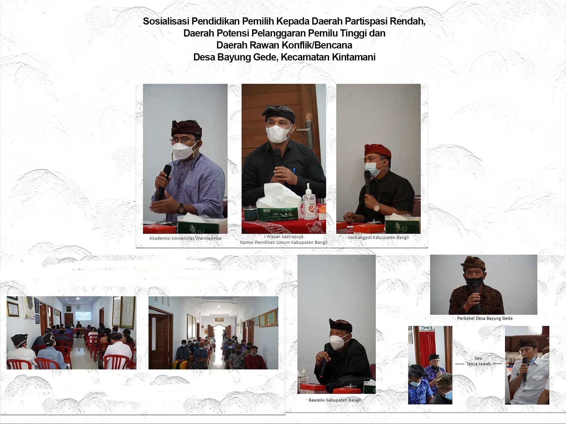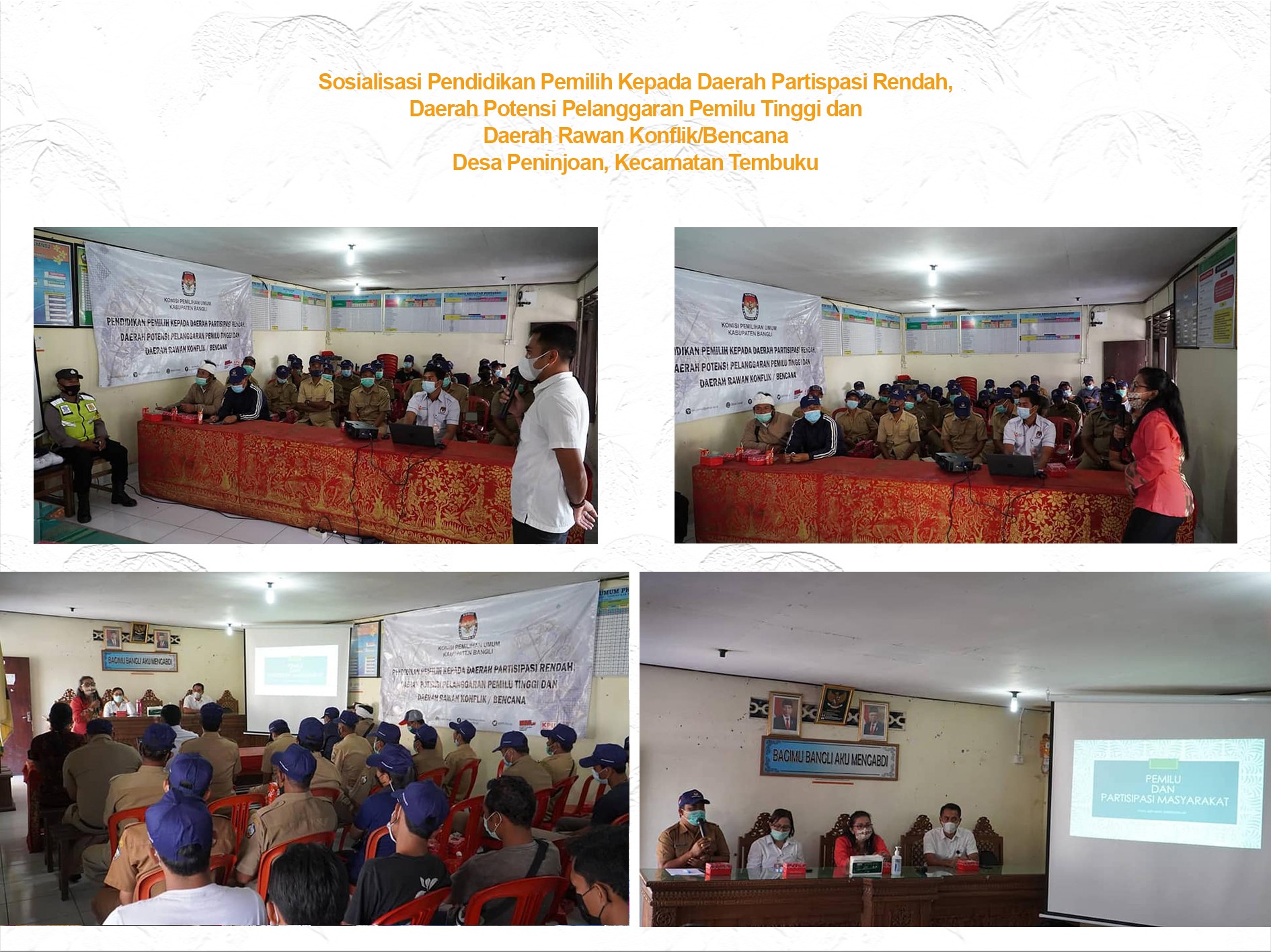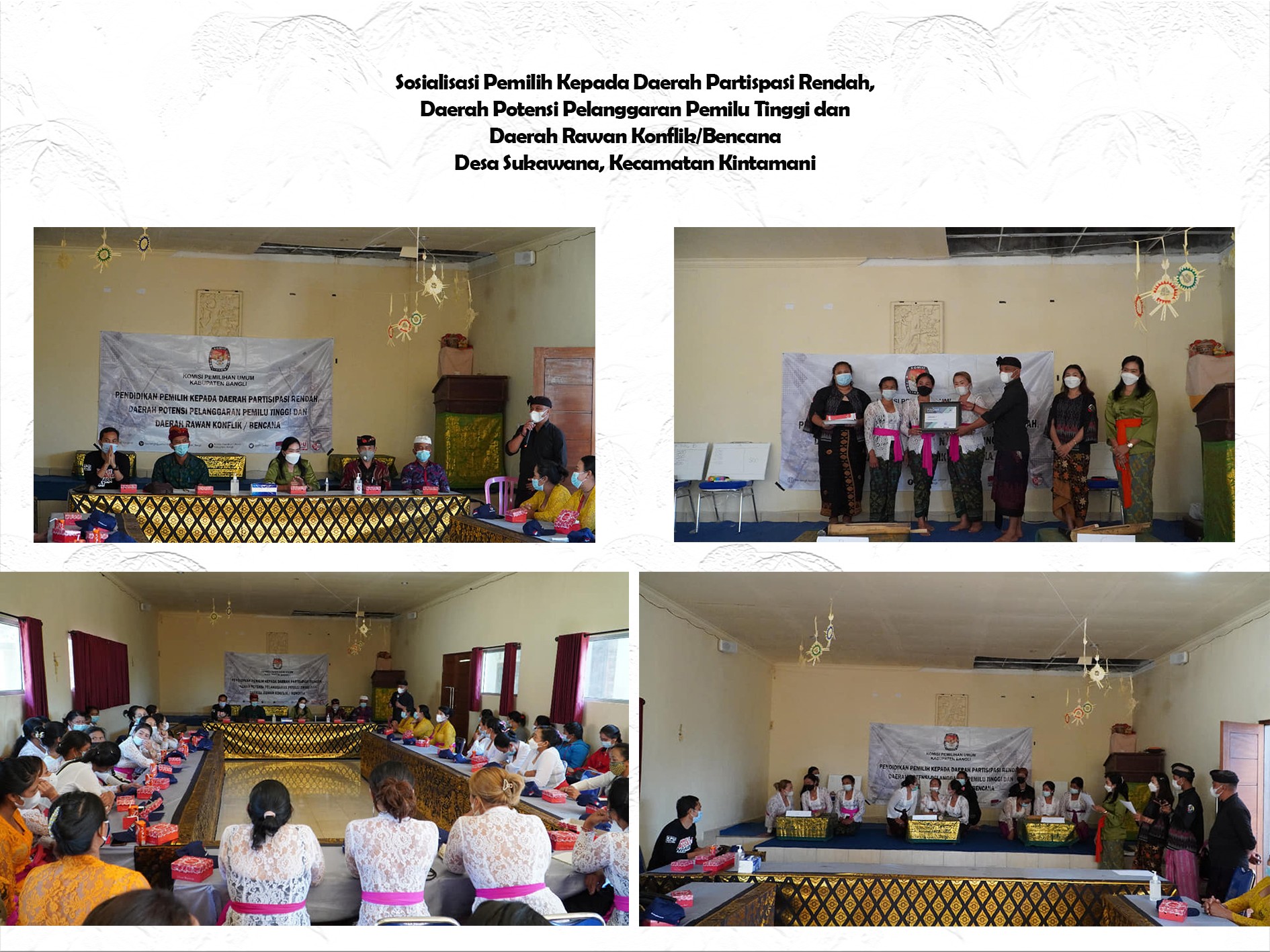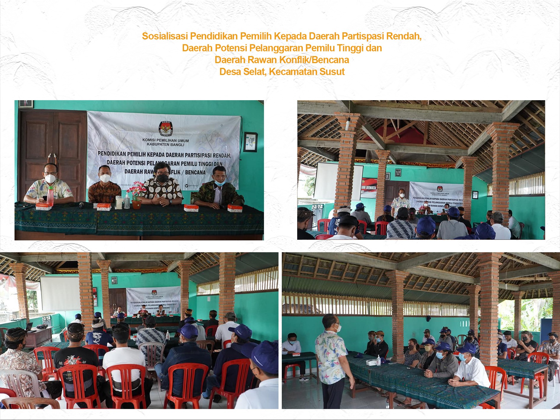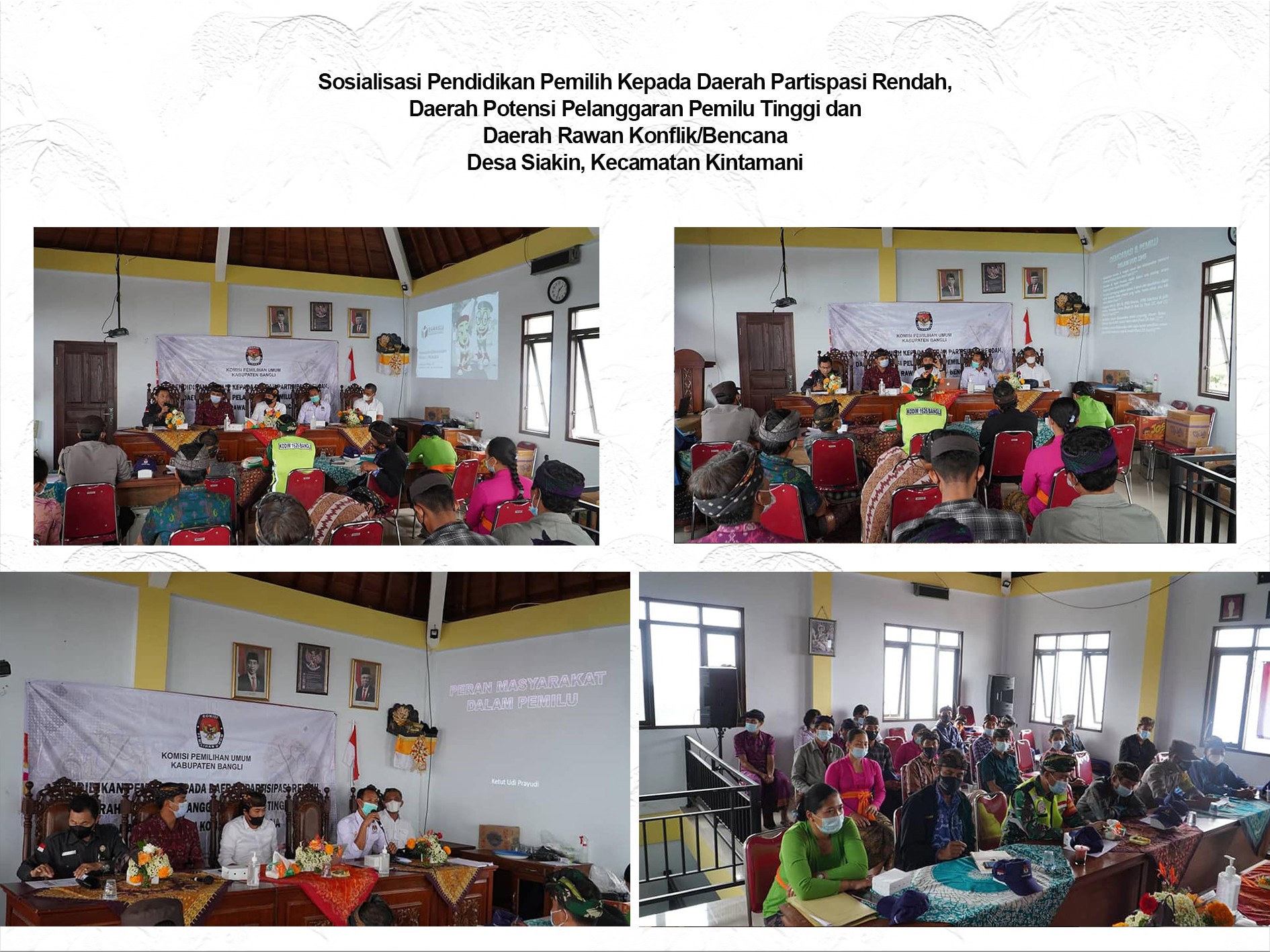 KPU Kabupaten Bangli melakukan kegiatan sosialisasi pendidikan pemilih kepada daerah partisipasi rendah, daerah potensi pelanggaran Pemilu tinggi dan daerah rawan konflik/bencana di Desa Siakin, Kecamatan Kintamani, (Senin, 7 Juni 2021).