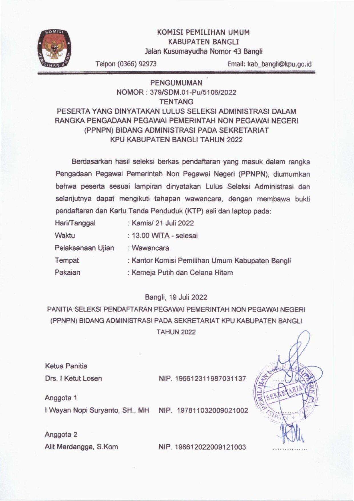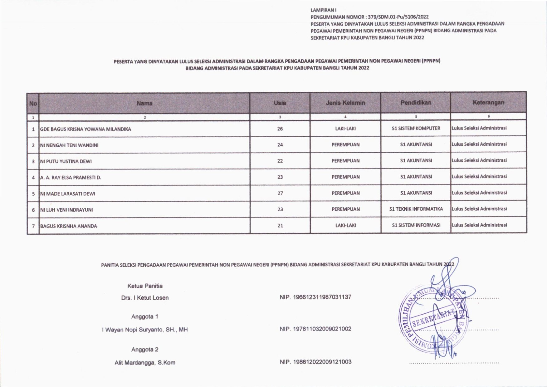 Pengumuman Peserta Lulus Seleksi Administrasi Dalam Rangka Pengadaan PPNPN Bidang Administrasi Pada Sekretariat KPU Kabupaten Bangli