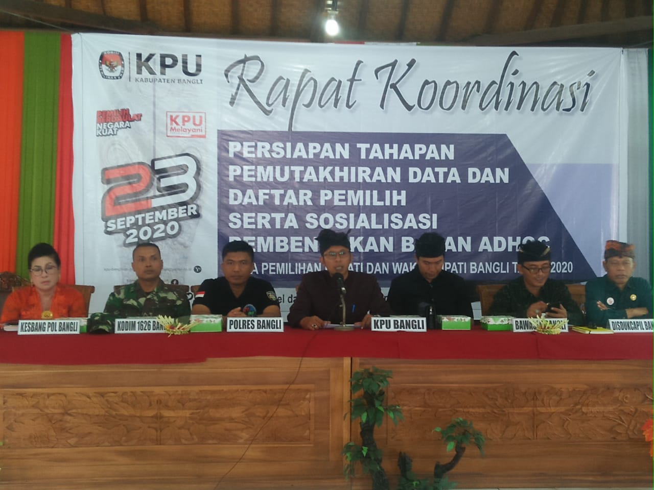Kapolres Bangli, AKBP. I Gusti Agung Dhana Aryawan yang hadir pada rapat ini menyampaikan untuk bersama-sama menyukseskan penyelenggaraan Pilbup Bangli 2020. Polres Bangli sebagai leading sektor keamanan yang paling depan siap mengamankan seluruh tahapan. Beliau juga menyampaikan Bangli yang sudah sangat terkenal dengan Kintamani sebagai pariwisata di Bali, harus selalu aman untuk bisa meningkatkan ekonomi masyarakatnya. Meminimalisir konflik yang terjadi dari data pemilih ini harus dilakukan, sehingga seluruh masyarakat yang berhak memilih bisa menggunakan haknya dengan baik.