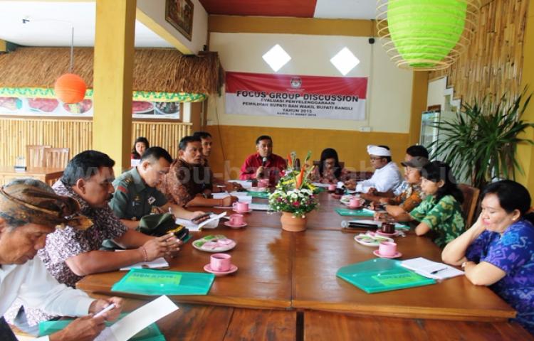 Sementara itu ketua KPU Kabupaten Bangli I Dewa Agung Gede Lidartawan,S.TP.,MP FGD ini dilakukan pihaknya dalam rangka mengeksplorasi secara lebih mendalam permasalahan yang terjadi dalam implementasi tahapan pemilihan serentak tahun 2015. Utamanya yang merupakan implikasi dari ketentuan dalam peraturan KPU. Juga bermaksud mengumpulkan berbagai gagasan yang solutif untuk direkomendasikan sebagai bahan revisi undang-undang pemilihan dan peraturan KPU untuk perbaikan penyelenggaraan pemilihan serentak berikutnya.