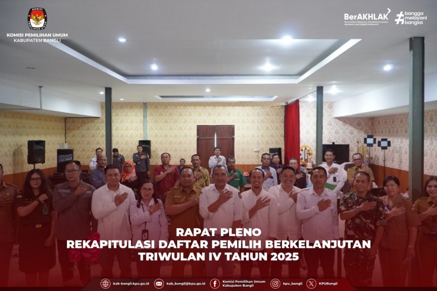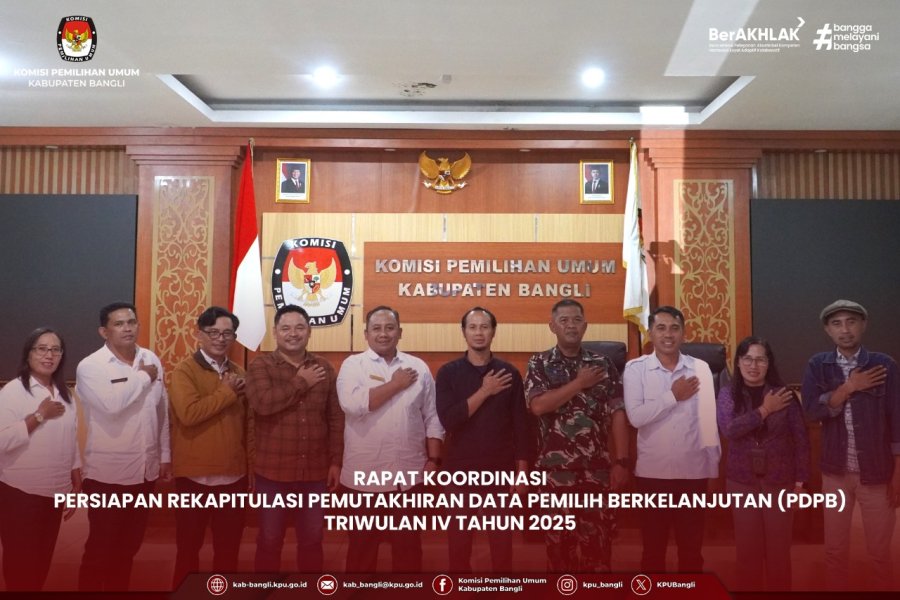 KPU Kabupaten Bangli melaksanakan Rapat Koordinasi Persiapan Rekapitulasi Pemutakhiran Data Pemilih Berkelanjutan (PDPB) Triwulan IV Tahun 2025 pada Rabu, 3 Desember 2025 bertempat di ruang rapat KPU Kabupaten Bangli. Kegiatan ini dihadiri oleh stakeholder terkait seperti Perwakilan dari Polres Bangli, Dandim 1626/Bangli, Kesbangpol Kabupaten Bangli, Disdukcapil Kabupaten Bangli, Dinas PMD PPKB Kabupaten Bangli, serta Bawaslu Kabupaten Bangli. Kegiatan rapat koordinasi ini dibuka oleh Ketua KPU Kabupaten Bangli, I Kadek Adiawan yang menyampaikan bahwa rapat koordinasi ini dilaksanakan untuk persiapan rekapitulasi PDPB triwulan IV tahun 2025 dan dilanjutkan dengan arahan dari Anggota KPU Provinsi Bali, I Gede John Darmawan mengenai kegiatan KPU non tahapan meliputi pemutakhiran data pemilih berkelanjutan dan pendidikan pemilih yang merupakan prioritas nasional. Dimana dalam pelaksanaan kegiatan ini KPU selalu melibatkan instansi terkait dan Bawaslu sebagai bagian dari pengawasan. Selanjutnya dilakukan penyampaian kegiatan pemutakhiran data pemilih pada triwulan IV oleh Ketua Divisi Perencanaan, Data dan Informasi, Ni Putu Anom Januwintari. Dimana pada triwuan IV KPU Kabupaten Bangli melakukan pemutakhiran data pemilih pindah masuk, pindah keluar, DP4 tersaring, ubah nama, pemilih baru, ubah status perkawinan, ubah tanggal lahir, dan pemilih yang berada di luar negeri sesuai data turunan dari KPU RI. Selain itu pada triwulan IV KPU Kabupaten Bangli juga menindaklanjuti data saran perbaikan Bawaslu. Terhadap data-data tersebut, KPU Kabupaten Bangli sudah melakukan verifikasi dan koordinasi terlebih dahulu dengan pihak terkait dan pencocokan terbatas (Coktas) sebelum dilakukan pencoretan ataupun penambahan pemilih serta perbaikan elemen data. Setelah penyampaian data, kegiatan dilanjutkan dengan menerima saran, tanggapan serta masukan dari peserta rapat. Dimana dari peserta rapat menyampaikan apresiasi dan dukungan untuk PDPB di Kabupaten Bangli. Dari Bawaslu juga menyampaikan masukan agar data yang ditindaklanjuti sudah dilengkapi dengan bukti dukung. Usai penyampaian saran, tanggapan serta masukan dari peserta rapat, kegiatan rapat koordinasi ini kemudian ditutup oleh Ketua KPU Kabupaten Bangli.