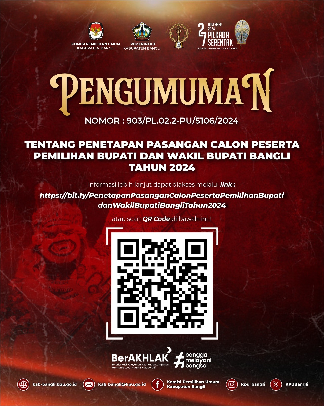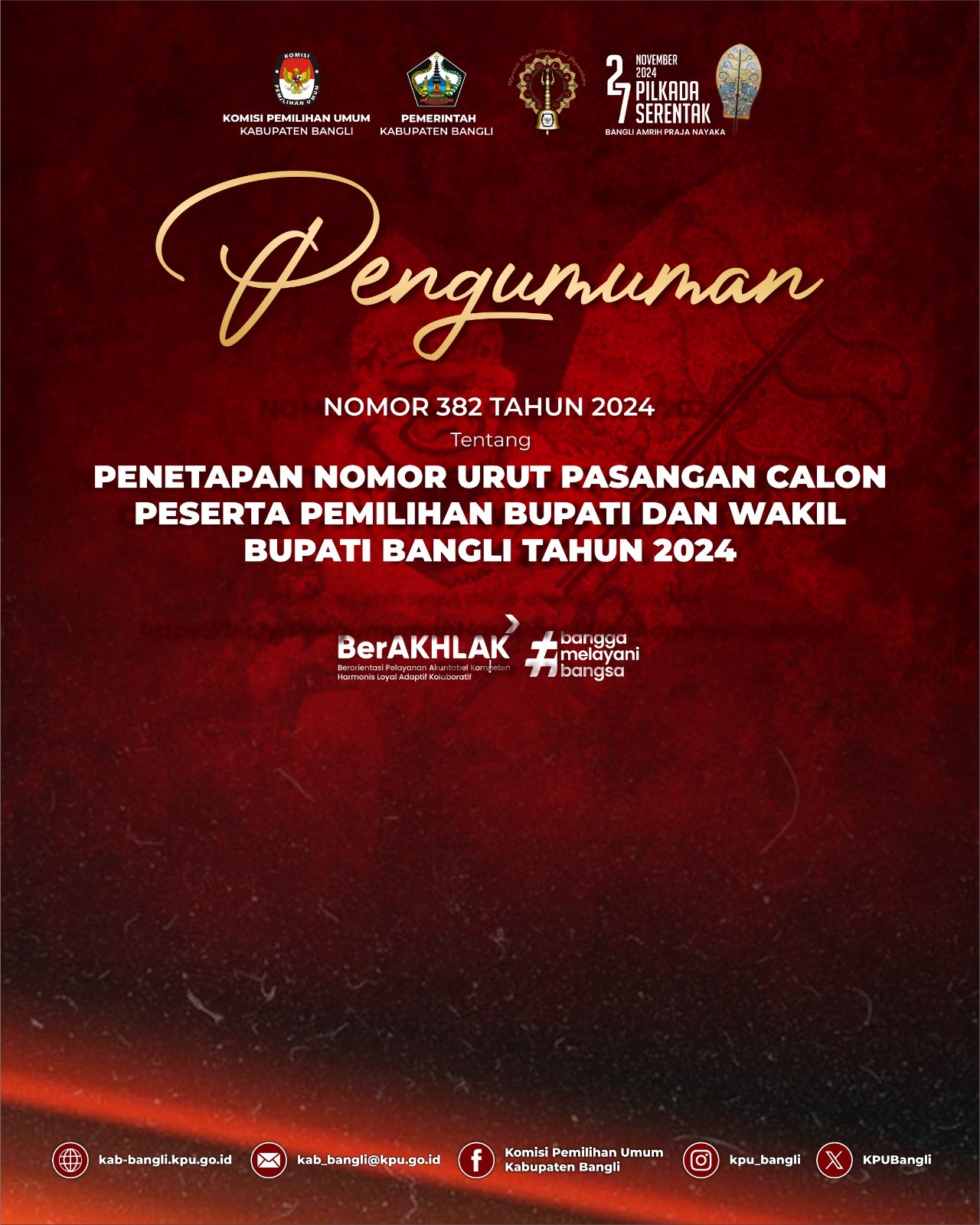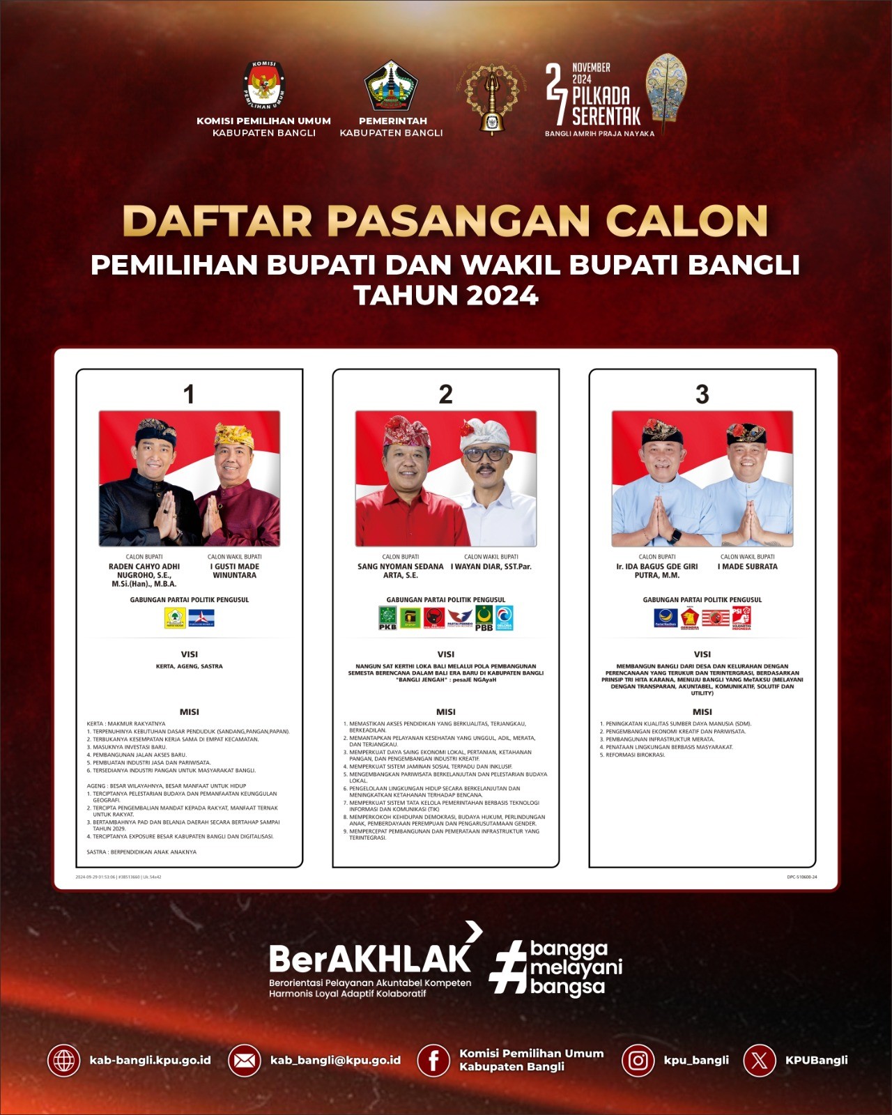 #temanpemilih, Komisi Pemilihan Umum Kabupaten Bangli mengumumkan hasil Penetapan Pasangan Calon Peserta Pemilihan Bupati dan Wakil Bupati Bangli Tahun 2024 (urutan berdasarkan jam dan hari pendaftaran) ditetapkan sebagai Pasangan Calon Bupati dan Wakil Bupati Tahun 2024, Minggu 22 September 2024.