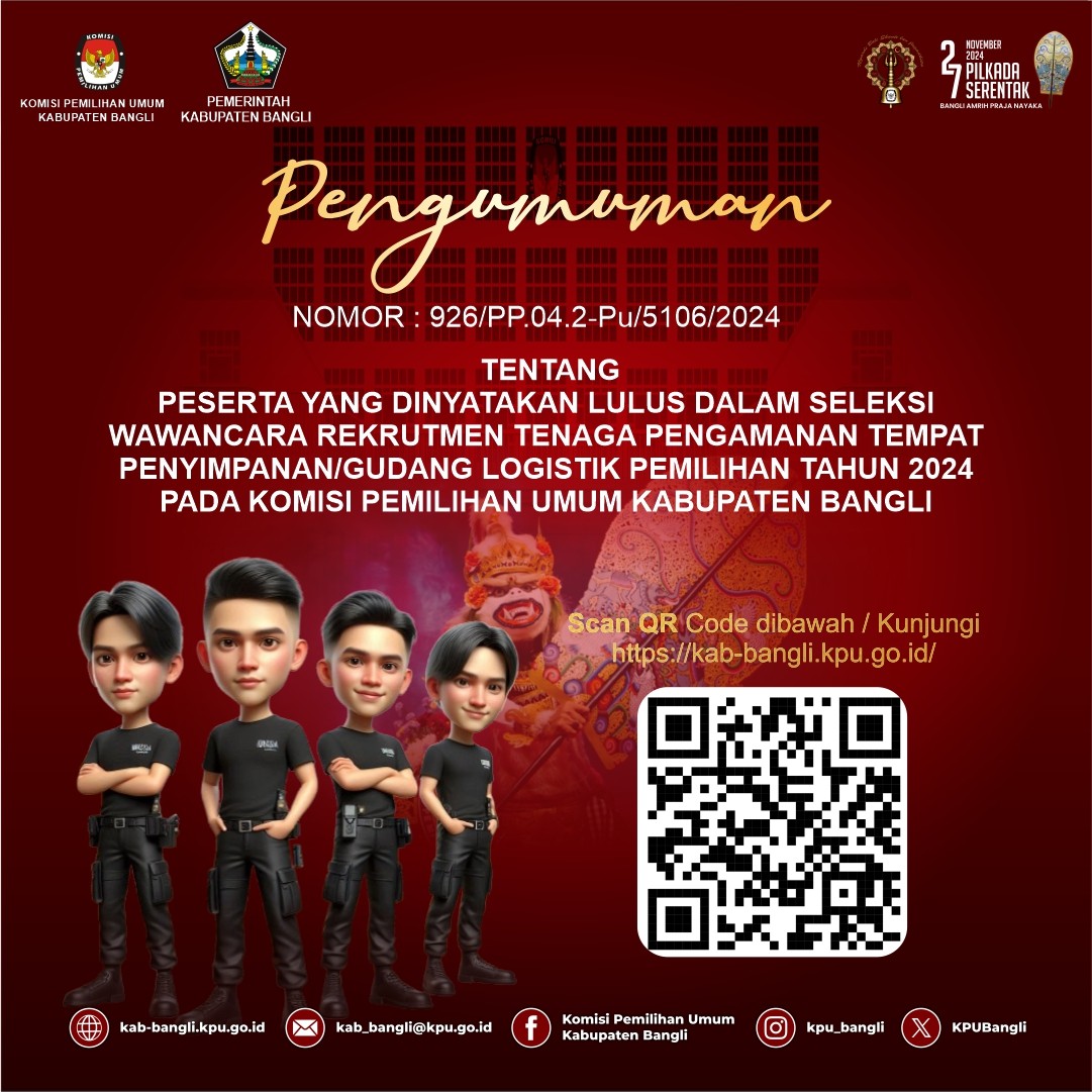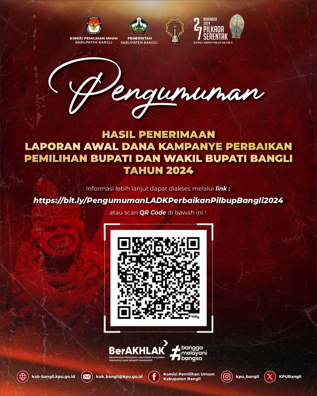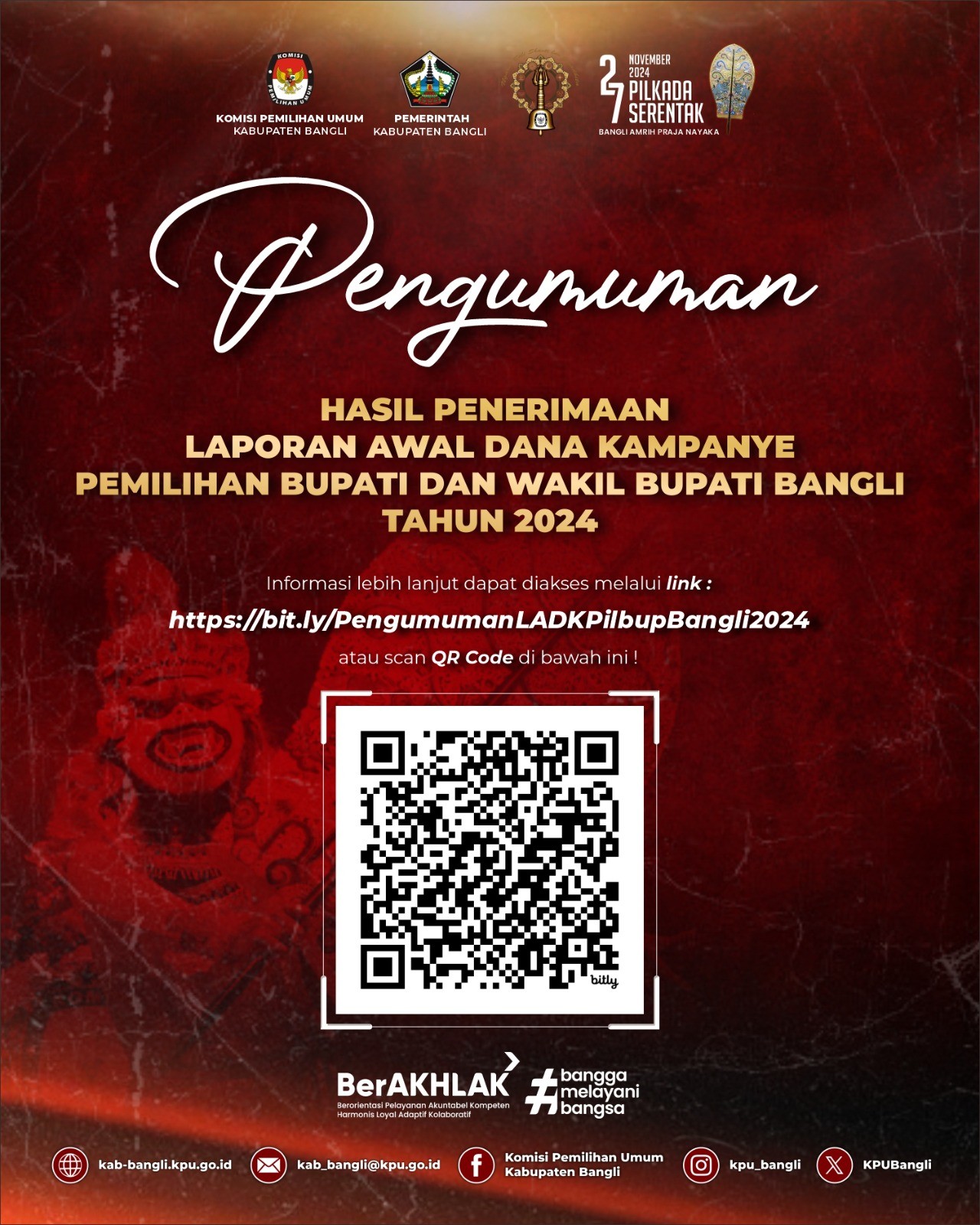 #temanpemilih, Komisi Pemilihan Umum Kabupaten Bangli mengumumkan hasil Penetapan Pasangan Calon Peserta Pemilihan Bupati dan Wakil Bupati Bangli Tahun 2024 (urutan berdasarkan jam dan hari pendaftaran) ditetapkan sebagai Pasangan Calon Bupati dan Wakil Bupati Tahun 2024, Minggu 22 September 2024.