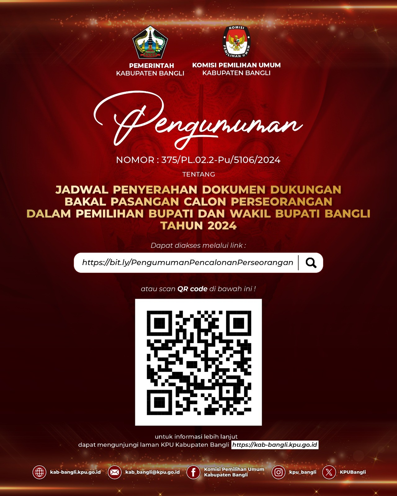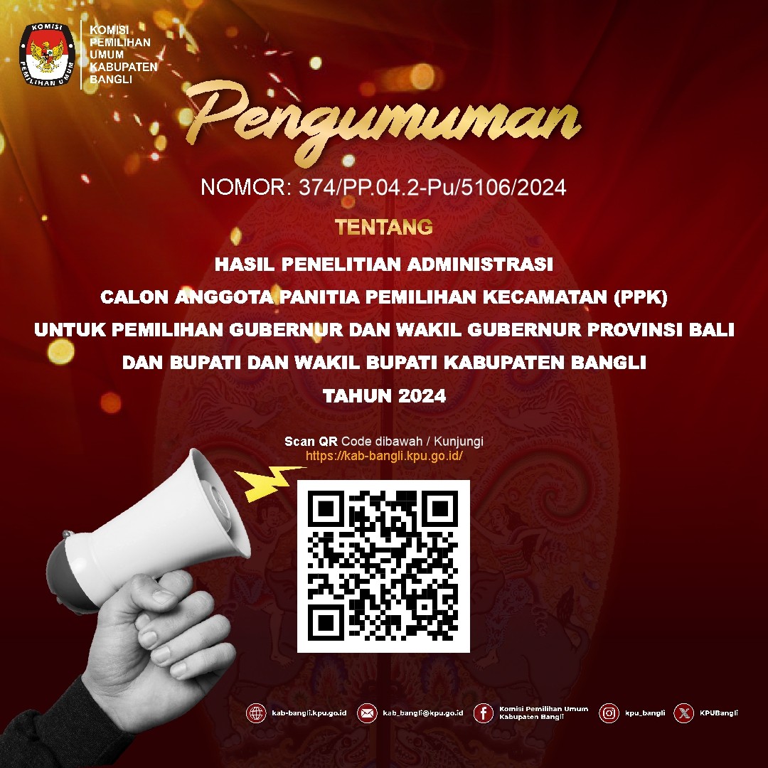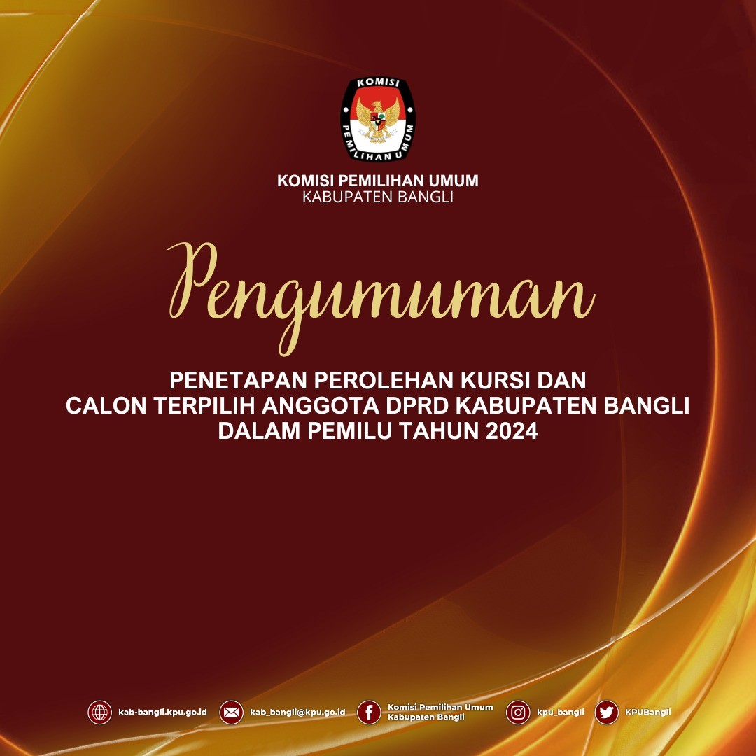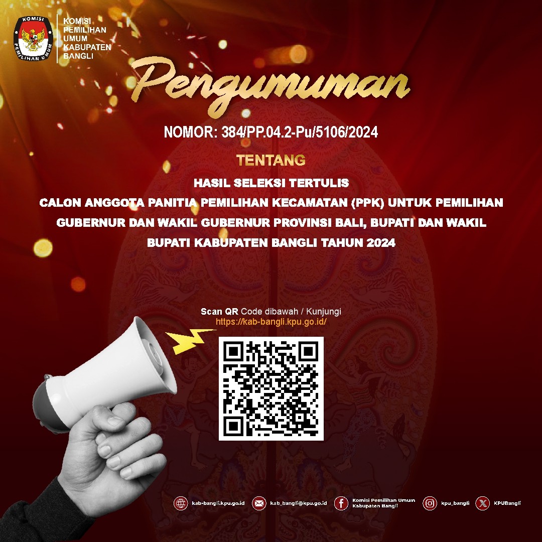 Daftar Pemilih Sementara (DPS) untuk Pemilihan Gubernur dan Wakil Gubernur serta Bupati dan Wakil Bupati Bangli Tahun 2024 dapat dilihat oleh masyarakat mulai tanggal 18 Agustus 2024 s/d 27 Agustus Tahun 2024 dikantor Desa/Kelurahan masing-masing. Selain melalui pengumuman di Kantor Desa/Kelurahan, Daftar Pemilih Sementara (DPS) juga dapat dilihat dilihat melalui link berikut: