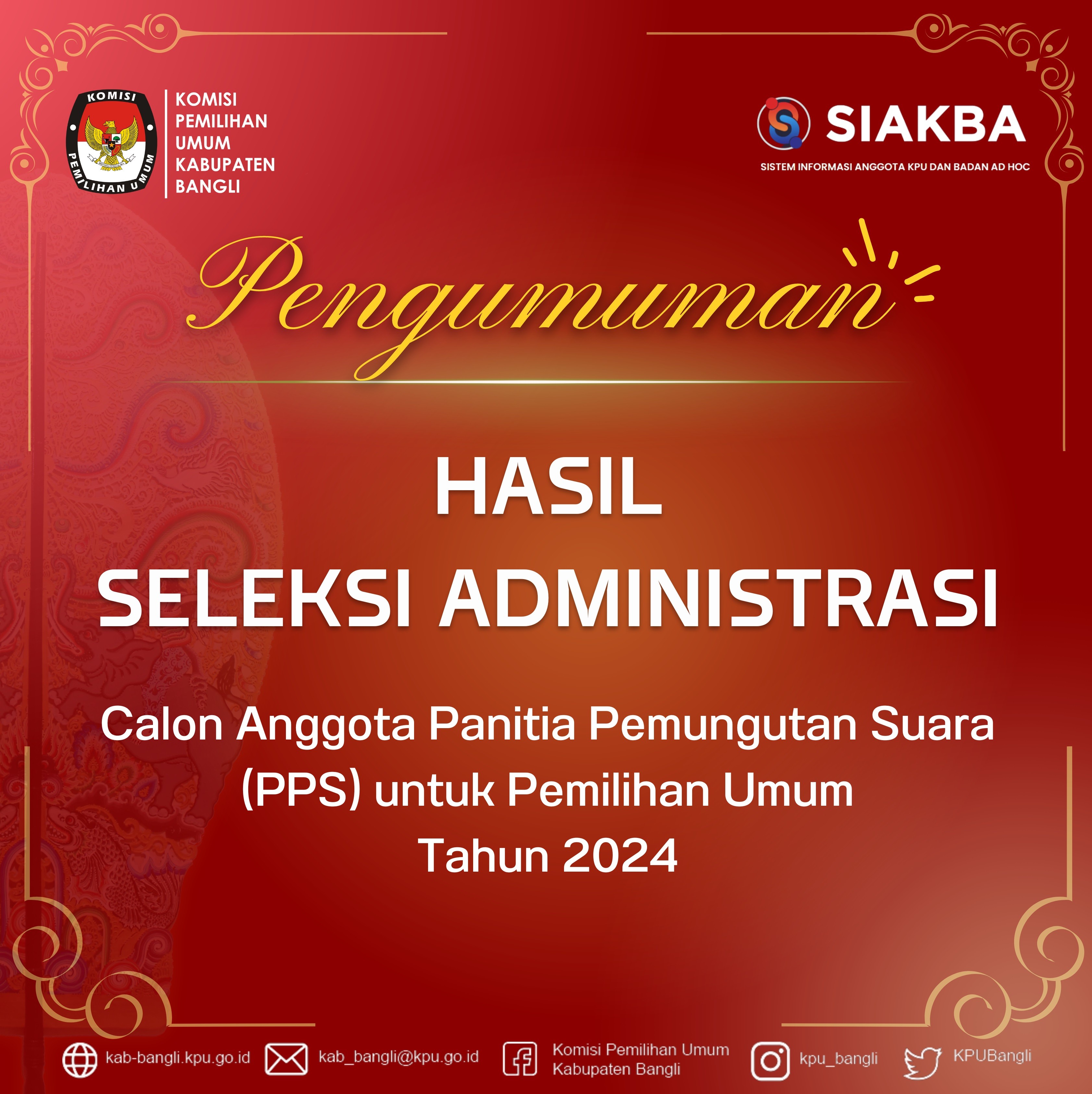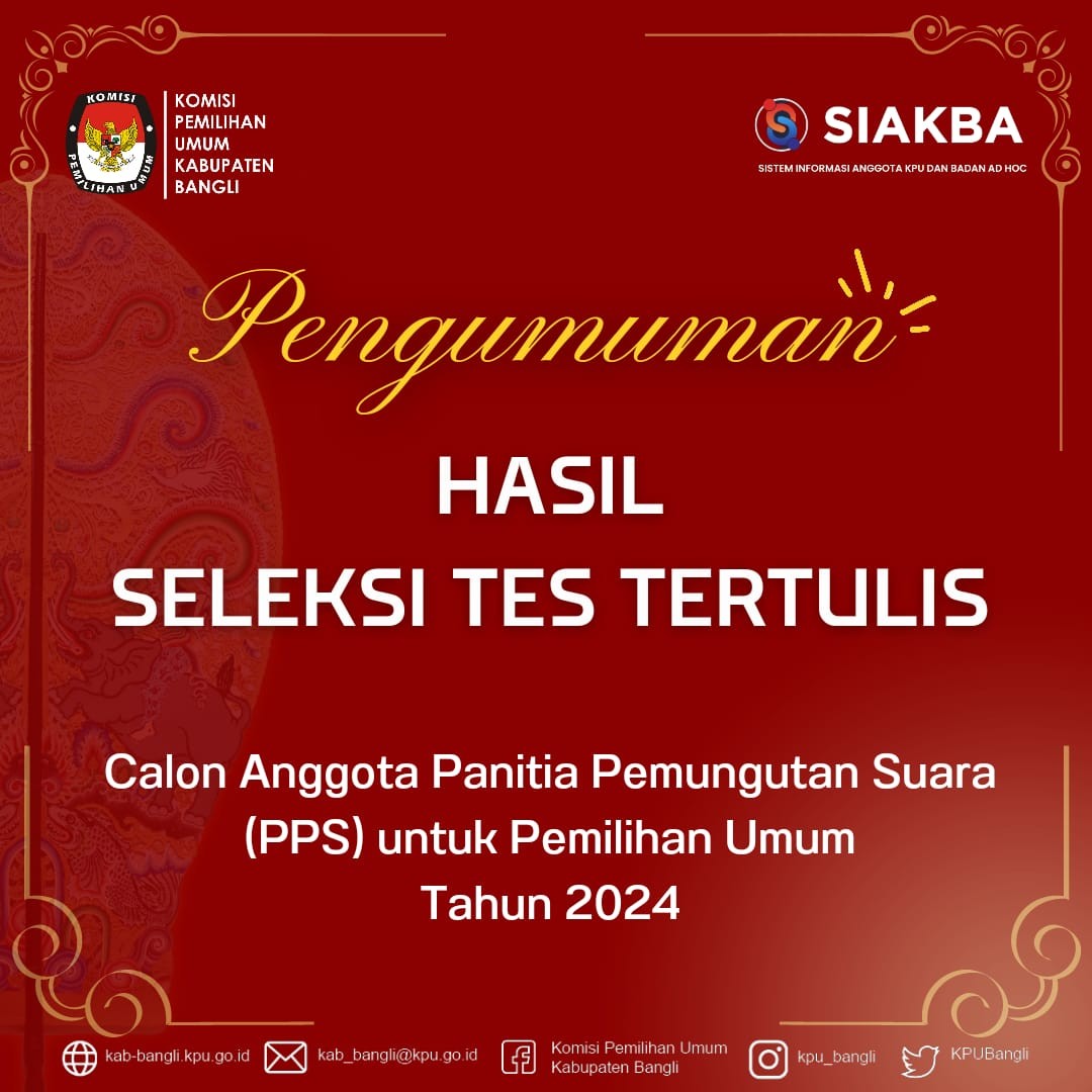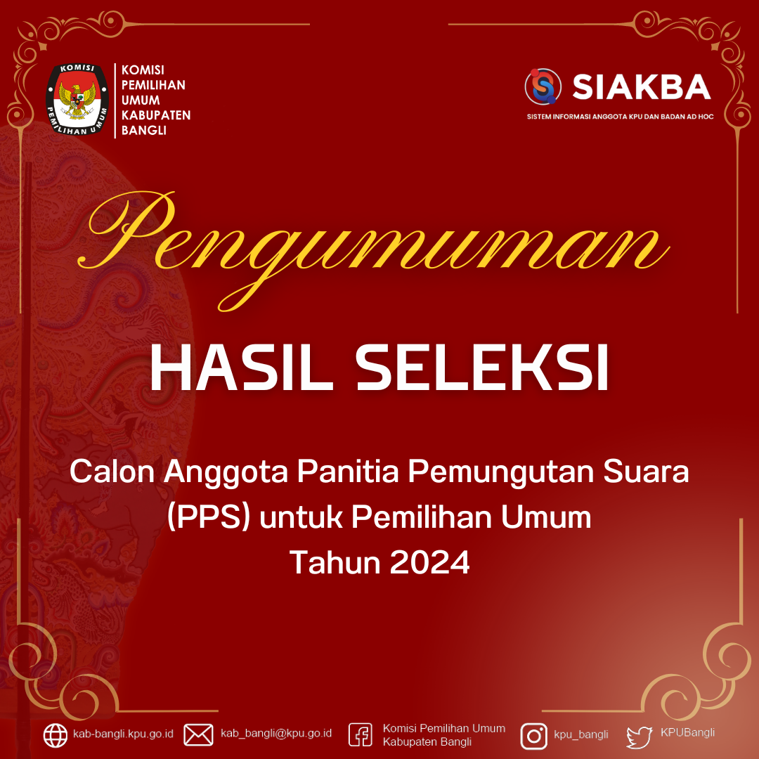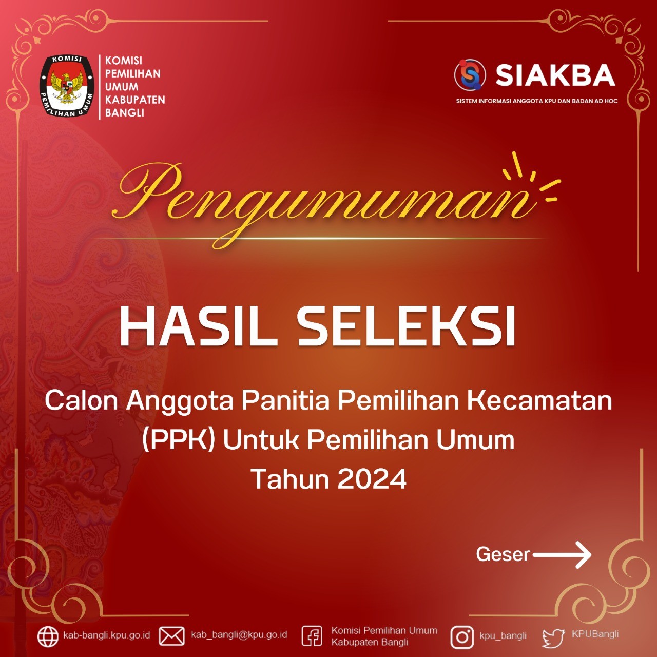 PENGUMUMAN HASIL SELEKSI CALON ANGGOTA PANITIA PEMILIHAN KECAMATAN (PPK) UNTUK PEMILIHAN UMUM TAHUN 2024 DAPAT DIUNDUH PADA LINK BERIKUT.